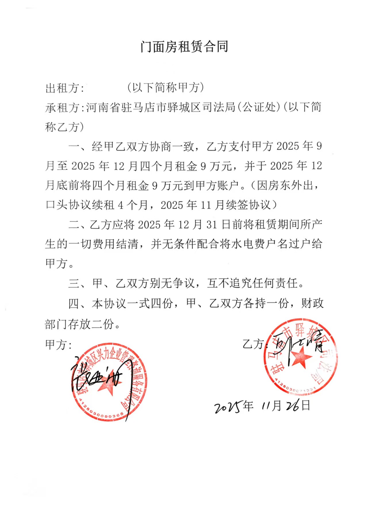 一、合同编号:驿政采购-2025-11-9-A ******服务中心房屋租赁 三、项目编号:驿政采购-2025-11-9 ******服务中心房屋租赁 五、合同主体 1. 采购人(甲方):驻马店市驿城区司法局 地址:解放路283号 联系人:岳拥强 联系方式:******331 ******有限公司 企业规模:小型 地址:驻马店市驿城区风光路与交通路交叉口西南角8号 联系人:张亚洲 联系方式:****** 六、合同主要信息 1、合同金额:90000 元 2、采购方式:竞争性谈判 3、履约期限、地点等简要信息: 解放路与薄山路交叉口沿街门面房,面积约400平,租赁为11月10至12月37日 4、合同主要标的信息